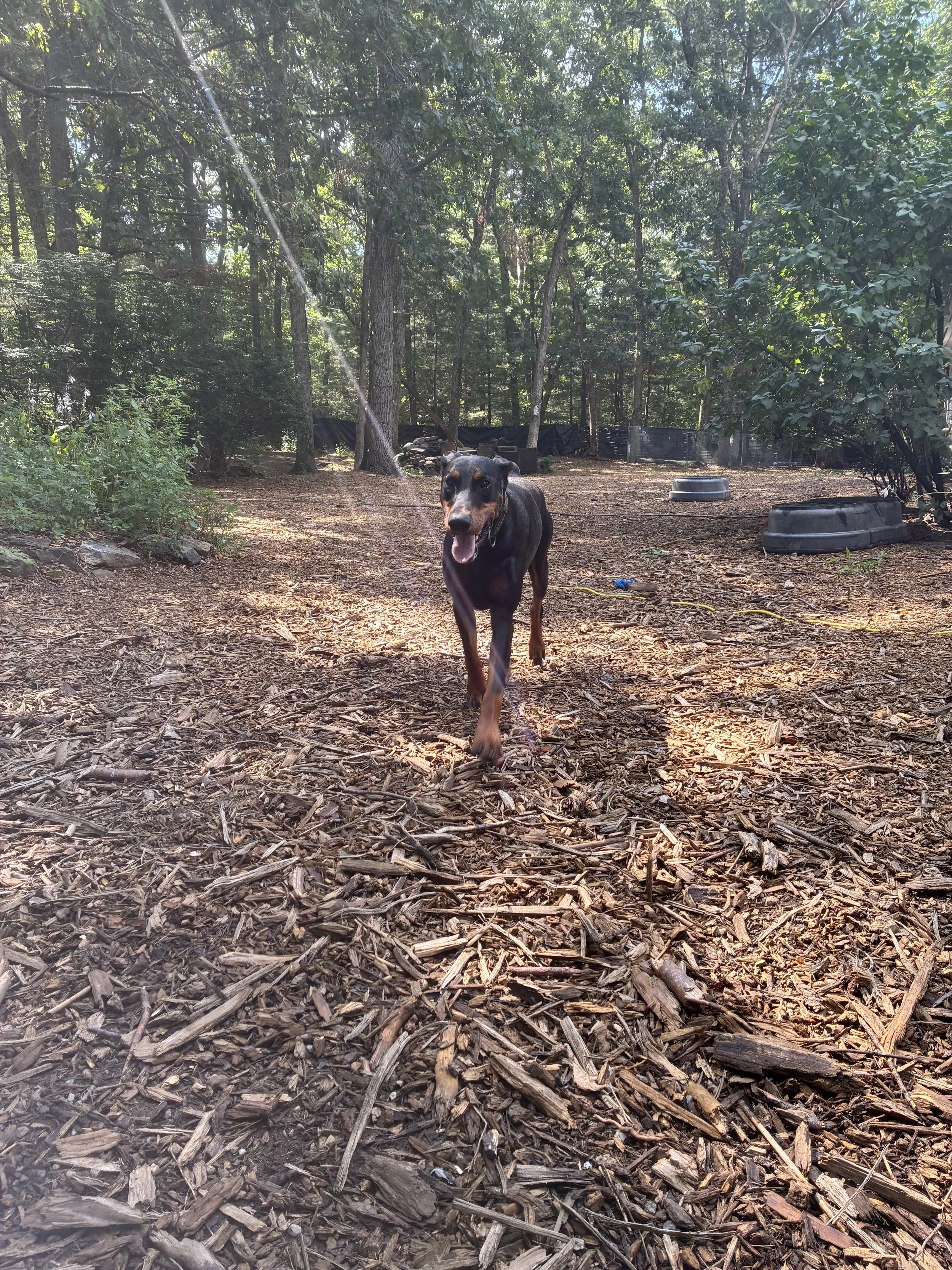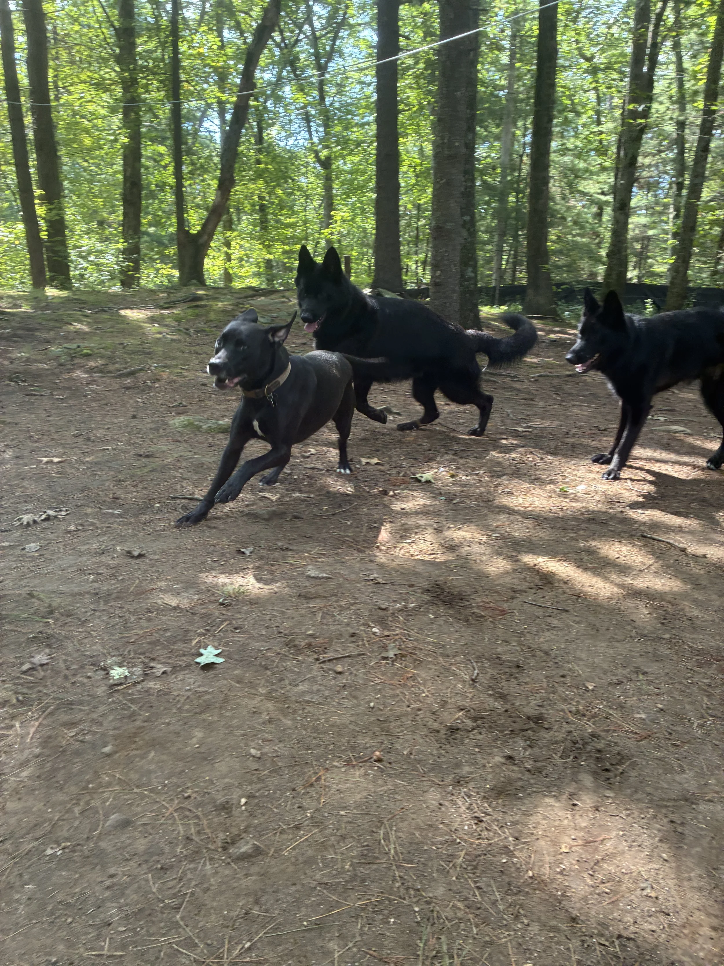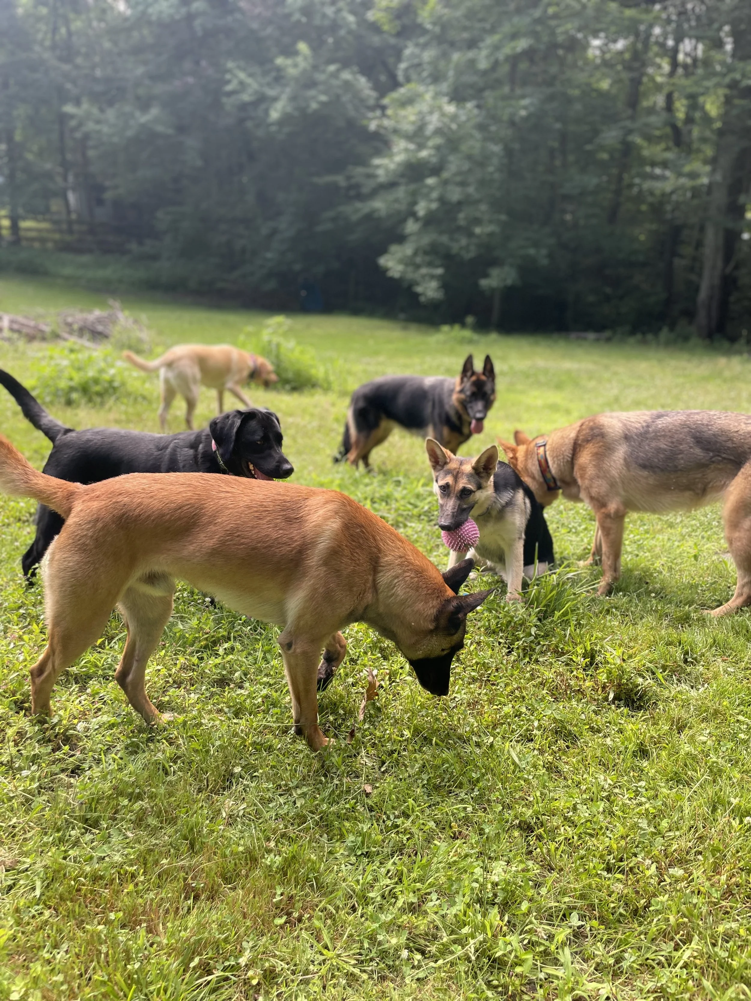 A spacious, farm style dog daycare where dogs can be dogs. Taking in fresh air, running, rolling in grass and digging holes, going on trail walks and playing with other dogs.