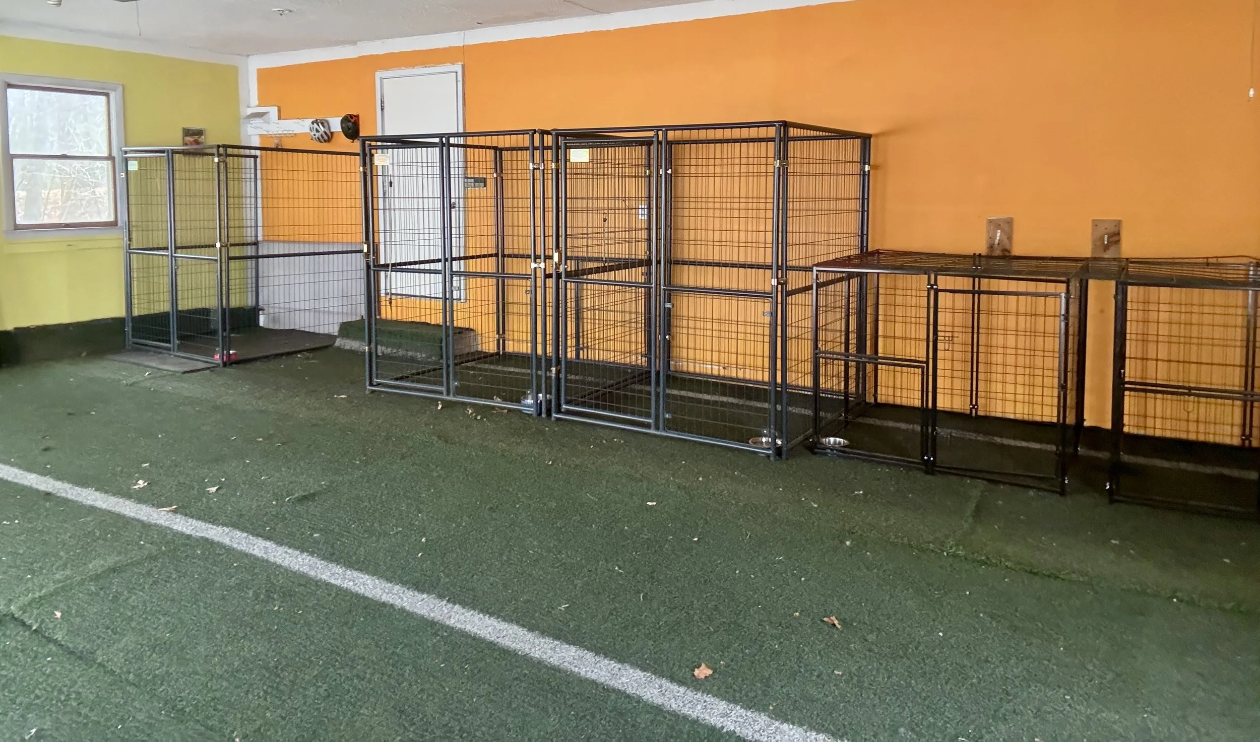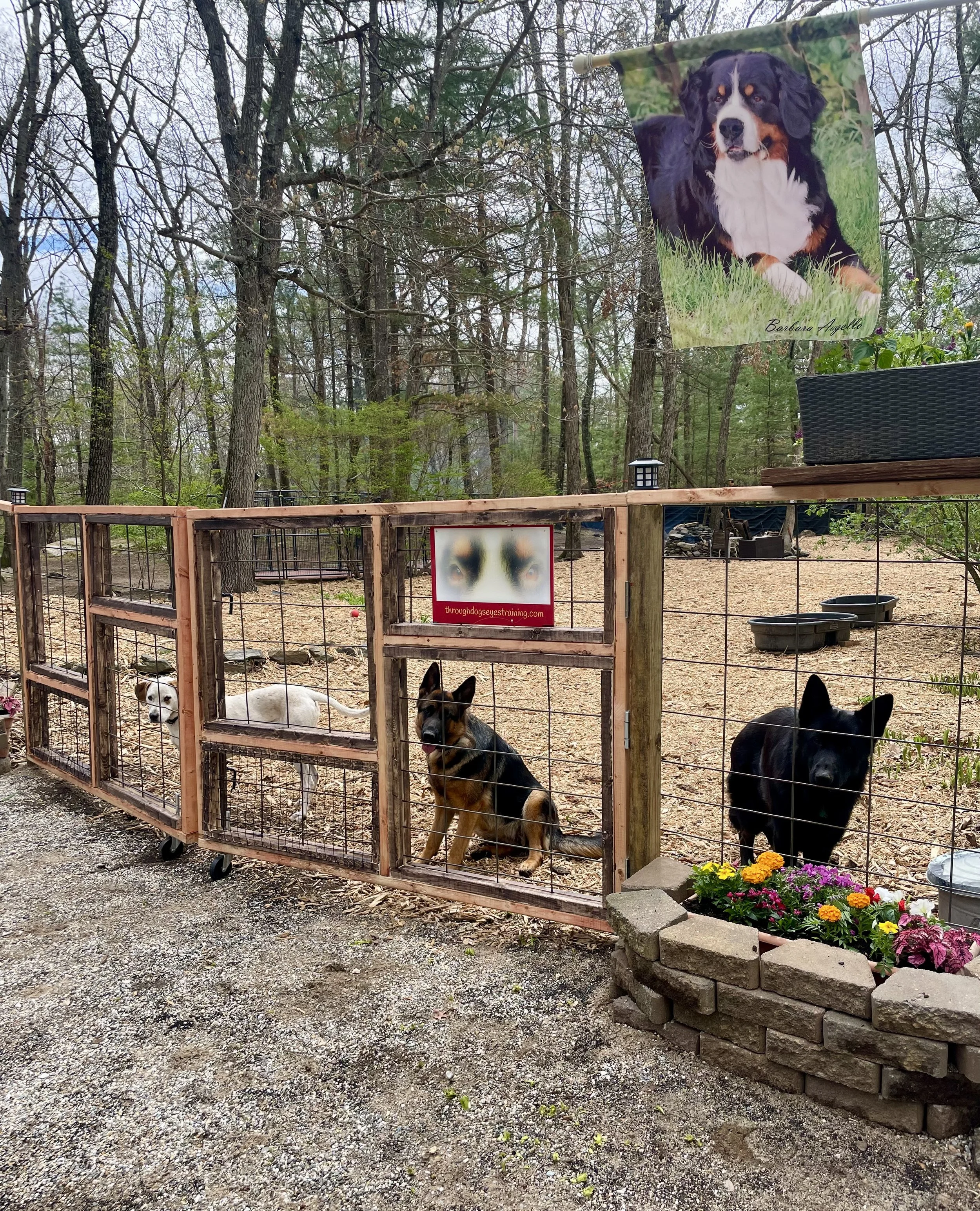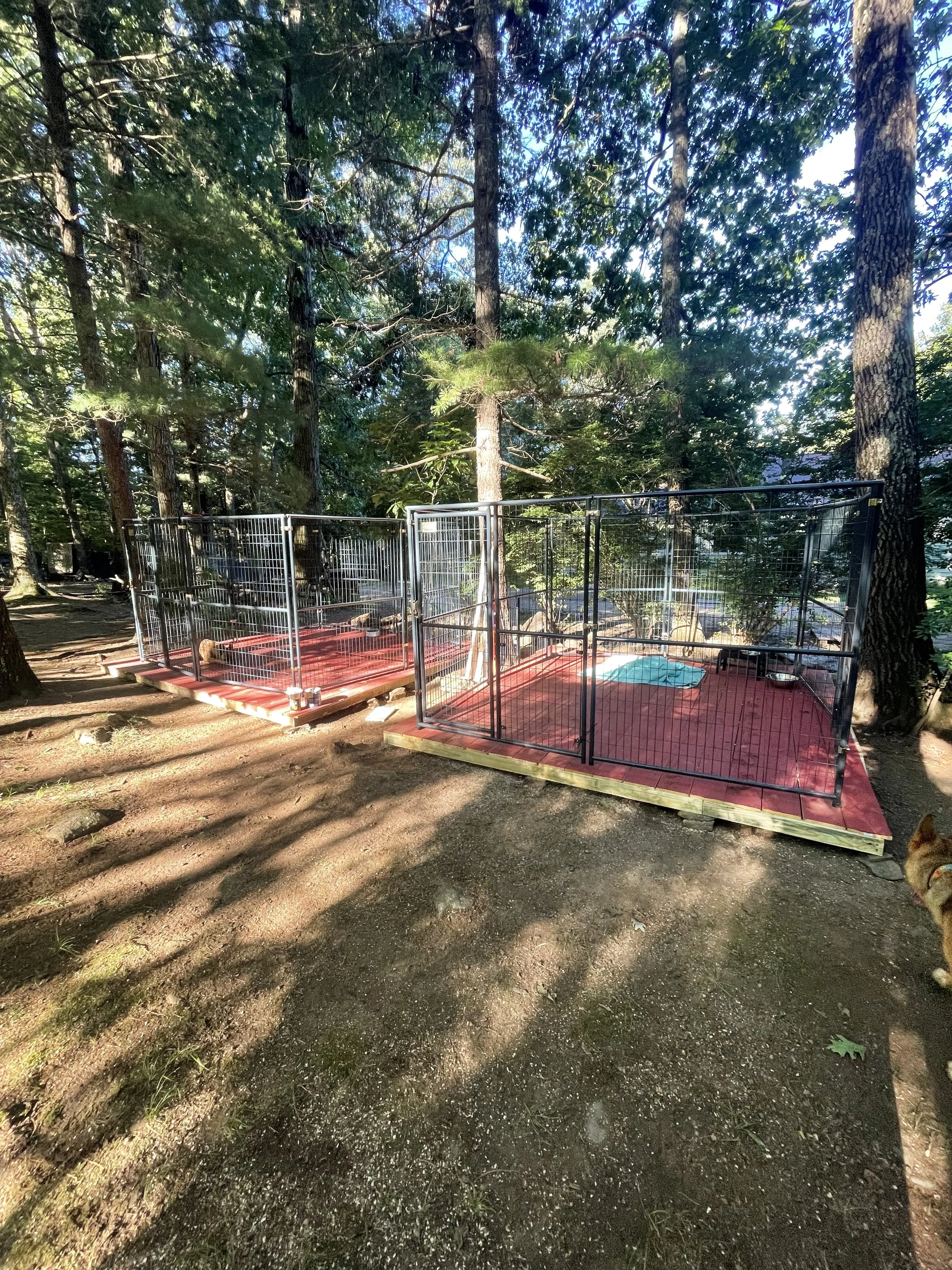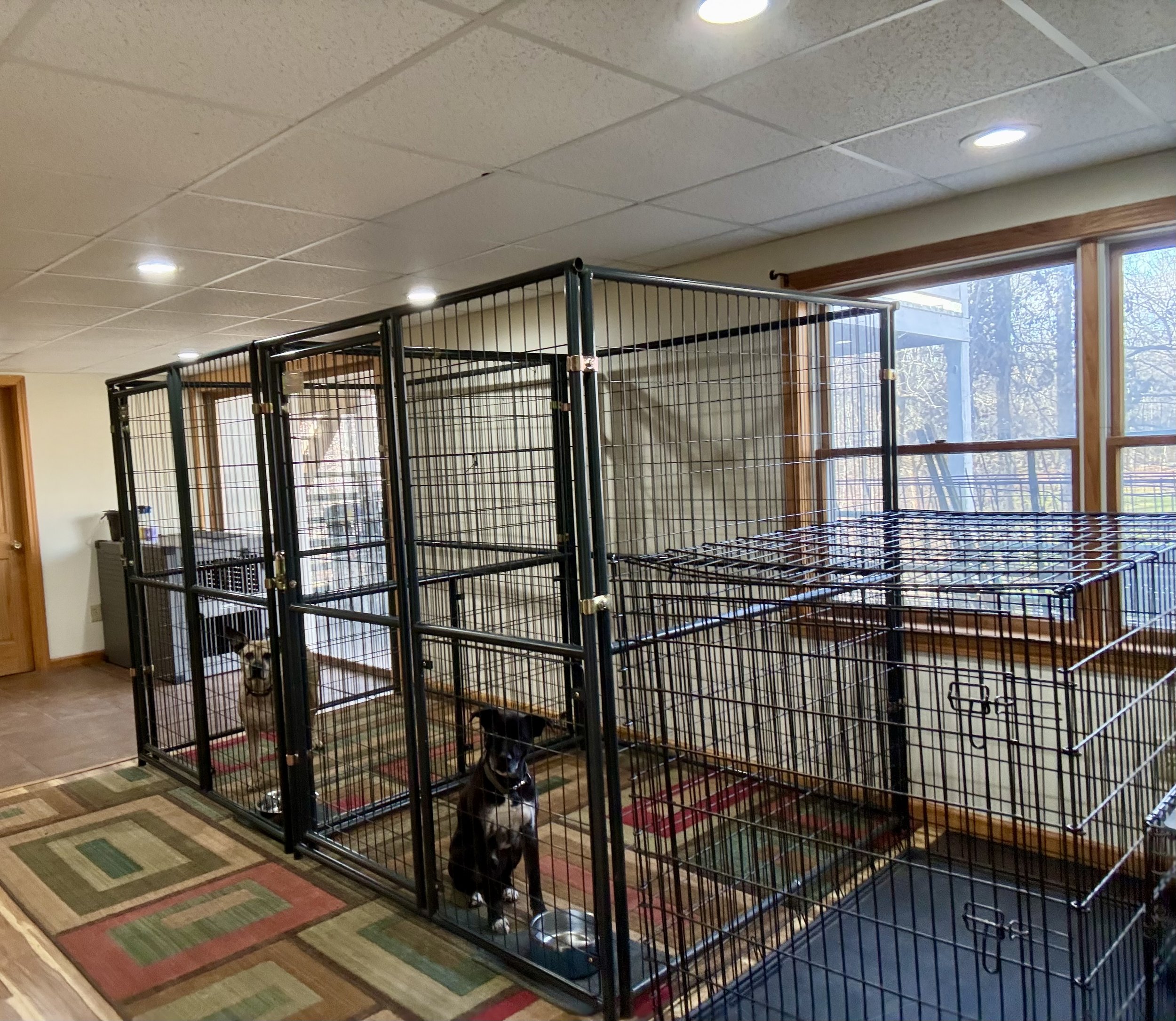 There are some kennels in the astroturfed garage as well as in the house down stairs. We also have plenty of crates that can be set up in the finished off porch at the front of the house. We have doors that open directly to the fenced yards making bringing the dogs in and out very easy.